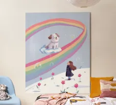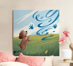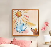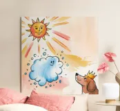 A crowned dog gazes upward at a smiling cloud and radiant sun. The imaginative setting invokes a sense of fantasy, celebration, and warmth beneath the glowing rays.