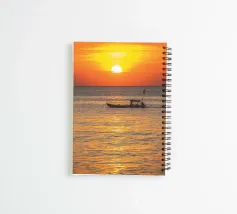 A small Vietnamese boat silhouetted on a calm sea at sunset.
