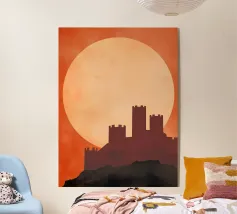 La maestosa silhouette di un castello medievale si erge dal bordo di una scogliera rocciosa, sullo sfondo di un sole arancione incandescente. L'audace contrasto tra l'architettura scura e il cielo sognante del tramonto evoca un senso di leggende dimenticate e regni antichi. Le texture minimaliste e le ombre a blocchi conferiscono all'opera un'estetica vintage moderna, perfetta per i sognatori, gli amanti del fantasy e coloro che sono attratti dal mistero e dalla grandezza.