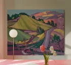 Un paesaggio affascinante, caratterizzato da una strada tortuosa che si snoda a cascata tra ondulate colline verdi e gialle, il tutto immerso nel caldo e drammatico bagliore di uno splendido cielo rosa e arancione al tramonto.