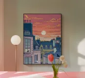 Pink and orange skies melt over a European rooftop scene with glowing windows and soft shadows.