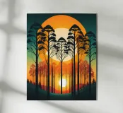 Sunset SereA captivating digital art depicting a serene forest at sunset. The tall, silhouetted trees stand tall against a vibrant backdrop of orange and yellow hues, creating a breathtaking scene. The setting sun casts long shadows, adding depth and dimension to the composition. This artwork evokes feelings of tranquility and peace, making it a perfect addition to any modern home.nade