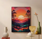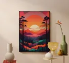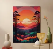 A vibrant and captivating landscape painting depicting a breathtaking sunset over a majestic mountain range. The scene is filled with rich colors and intricate details, creating a truly mesmerizing artwork.