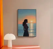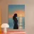A serene woman gazes over the calm sea as the sun melts into the horizon. The soft light and muted palette make this artwork a symbol of reflection, peace, and evening calm.