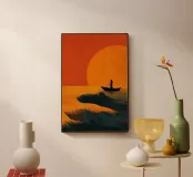 Una figura. Acque infinite. Un cielo in fiamme. Sunset Voyager è una meditazione grafica sulla solitudine e sulla direzione, dove il percorso è fluido e la destinazione indefinita. Il sole arancione incombe su onde dinamiche e lineari, guidando la silhouette solitaria in un mare di silenzio. Perfetto per gli interni moderni che celebrano il simbolismo, il viaggio e l'impatto minimalista. Un pezzo di grande effetto con una tranquilla profondità emotiva.