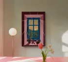 A tranquil scene of two cups of tea on a windowsill, with a view of a beautiful sunset through the window. The composition is peaceful, romantic, and captures a perfect, quiet moment.