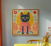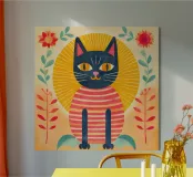 A charming and cheeky cat illustration brought to life in warm, friendly hues. This adorable feline radiates playful sass and irresistible personality, making it a delightful addition to any space. Whether featured on wall art, pillows, tote bags or mugs, this design brings a cozy and whimsical touch to your decor or makes a purr-fect gift for cat lovers and color enthusiasts alike.