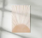 Captivating abstract design featuring radiant light rays in light brown extending outward from a central point, creating a sense of warmth and energy against a beige background.