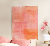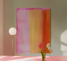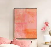 Moderno astratto di pittura laminata stratificata e strutturata in arancioni e rosa caldi.