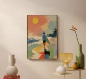 Un surfista cammina sulla spiaggia con la sua tavola da surf in uno stile moderno di metà secolo. Colori pastello brillanti, cieli estivi e soleggiati, composizione dinamica e retrofuturismo creano un vivace paesaggio costiero ricco di luci, ombre e atmosfere estive.