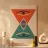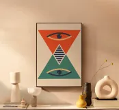 Un poster astratto visivamente simbolico che utilizza forme geometriche per creare una forma a clessidra, suggerendo i temi del tempo e della dualità. Il disegno presenta un grande triangolo rovesciato di colore rosso corallo nella parte superiore e un grande triangolo di colore verde scuro nella parte inferiore, che si incontrano in un motivo centrale di diamanti a strisce. All'interno di ogni grande triangolo è incastonato un occhio stilizzato con una pupilla segmentata, nei colori navy e giallo pallido, che conferisce all'opera un elemento surreale e figurativo. Quest'opera d'arte fonde la precisione geometrica del Bauhaus con un sottile simbolismo. Questo download digitale ad alta risoluzione (7000x5000 pixel, 300 dp