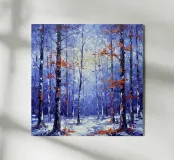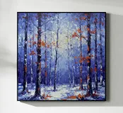 Questa straordinaria opera, "Crimson Whispers in a Winter Wood", è un dipinto a olio fortemente strutturato creato con una spatola, che cattura la tranquilla bellezza di una foresta invernale. L'opera è dominata da una tavolozza fredda ed eterea di blu profondi, lavanda e bianco, che raffigura il terreno coperto di neve e i tronchi spogli ed eleganti di betulle e querce. Questi toni freddi sono drammaticamente contrastati da vibranti schiocchi di foglie calde, arancioni e cremisi, aggrappate ai rami. I tratti spessi e tattili creano una qualità tridimensionale, invitando a percepire l'aria frizzante e il silenzio della foresta.