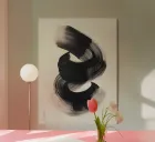 A bold, flowing black brushstroke in dynamic motion on a neutral background, evoking simplicity, balance, and harmony in a minimalist artistic composition inspired by Zen philosophy.