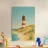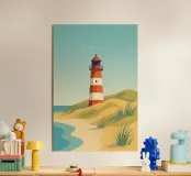 Design minimalista e decorativo di un viaggio estivo con una bella spiaggia e il faro di List-Ost a Sylt. Il tipico faro rosso e bianco che si trova sulle coste del Mare del Nord e del Mar Baltico. Design per vacanze estive per tutti coloro che amano andare in vacanza a Sylt o sulla costa tedesca del Mare del Nord.