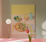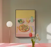 Questa illustrazione straordinariamente vivace è una festa per gli occhi, catturata in un audace design Color Block di rosa caldo e giallo brillante. Il centrotavola presenta due deliziosi tacos su un piatto arancione brillante, accompagnati da un'insalata fresca e da una limonata rinfrescante. La composizione è estremamente grafica e minimalista, con colori forti come il verde menta e le posate color lavanda che aggiungono un contrasto giocoso. Questo pezzo è il massimo esempio di Dopamine Decor e Pop Art minimalista, perfetto per una cucina o una zona pranzo contemporanea e gioiosa. Una colorata celebrazione del martedì dei tacos! Sperimentate l'eccellenza di