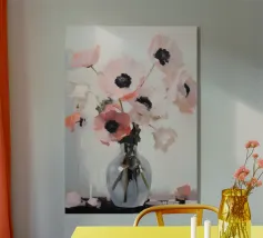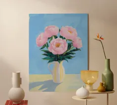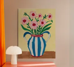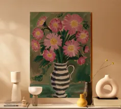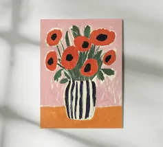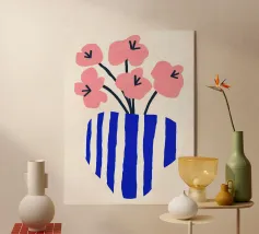 Questa illustrazione minimalista mostra un'elegante tazza di ceramica a righe bianche e nere, circondata da fiori rosa e foglie verdi. Sullo sfondo beige, l'allegro bouquet di fiori irradia leggerezza estiva e porta la freschezza botanica in ogni stanza!