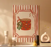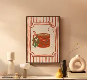 Un'illustrazione allegra e nostalgica che raffigura una tazza fumante di cioccolata calda con tanto di marshmallow. La tazza rossa è giocosamente avvolta da luci natalizie colorate e decorata con un rametto di vischio, legato con un piccolo fiocco rosso. L'opera d'arte è incorniciata da un bordo ornamentale e posta su uno sfondo a strisce rosse e crema disegnate a mano, che le conferiscono un'affascinante atmosfera natalizia retrò. Questo poster digitale di alta qualità (7000x5000 pixel, 300 dpi) garantisce una stampa nitida e vibrante, perfetta per aggiungere un tocco accogliente e moderno di metà secolo alla vostra cucina o alla vostra postazione caffè.