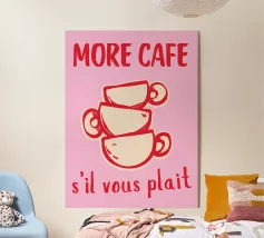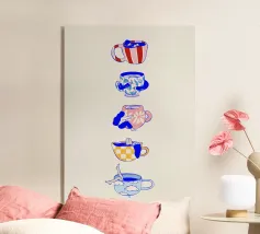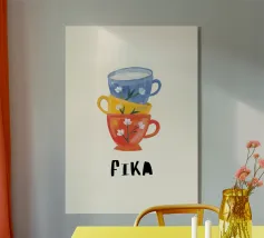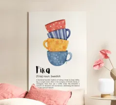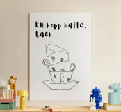 Diverse tazze di caffè sono giocosamente impilate l'una dentro l'altra e formano un motivo armonioso e minimalista. Compare anche la scritta svedese "en kopp kaffe, tack" ("una tazza di caffè, per favore"). La combinazione è calda, invitante e tipicamente scandinava.