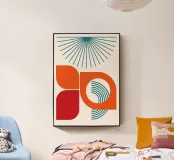 Questo accattivante poster presenta un elegante design astratto in stile Mid-Century Modern con forme geometriche arrotondate che ricordano forme floreali retrò in una calda tavolozza di arancione brillante e rosso intenso. Un audace motivo a raggiera verde acqua si irradia dalla parte superiore, fornendo un contrasto fresco. La composizione comprende archi concentrici di colore verde acqua integrati nelle forme arancioni, che aggiungono movimento e dettagli. Il pezzo è pulito e vivace su uno sfondo color crema. Questo poster digitale di qualità superiore viene fornito a 7000x5000 pixel, 300 dpi, garantendo una riproduzione di alta qualità e l'eccellenza artistica. Tags :