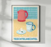 Illustration of a table scene with a teacup, tea bag and kettle. The motif is on a transparent background. The cream-coloured background tone can be changed if you want to design your product in your own colour.