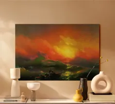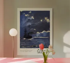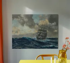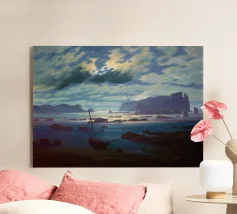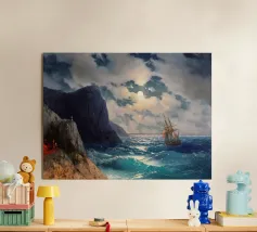 L'opera di Ivan Aivazovsky Tempesta in mare in una notte di luna ritrae l'impressionante potenza della natura. Nuvole scure di tempesta attraversano il cielo mentre le onde si infrangono violentemente sotto un fugace bagliore lunare. La tensione tra il tumulto e la luce cattura sia il pericolo che la bellezza, rendendo questo dipinto un centro d'arte drammatico per gli appassionati di arte marina e di ispirazione nautica inmarine art, romantic seascape, tempesta in mare, nautical wall décor, ocean storm painting, maritime drama, russian marine artist, navy ship in storm, atmospheric seascape, night ocean art, coastal wall décor, nautical gift, sea power painting