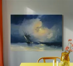 Questo suggestivo paesaggio marino di Ivan Aivazovsky raffigura un'imbarcazione che affronta onde turbolente al chiaro di luna. Il contrasto tra la luce argentea e l'acqua scura e agitata accresce il dramma e conferisce alla scena un'atmosfera poetica e ammaliante. La maestria di Aivazovsky nel gestire la luce e il movimento conferisce tensione e bellezza al mare notturno. La sua presenza lunatica e cinematografica lo rende particolarmente adatto a salotti, studi, biblioteche e interni raffinati che privilegiano un'arte drammatica e d'atmosfera.