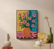 A bouquet of pink flowers in a terracotta vase sits on a patterned pink and black surface. The background is a block of vibrant turquoise, creating a playful and stylish composition that celebrates color and pattern.