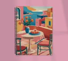 Un'incantevole terrazza con vista su una città costiera mediterranea baciata dal sole e sul mare, con tavoli apparecchiati per un pasto, che evoca un'esperienza gastronomica rilassante e pittoresca.