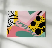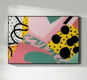 A modern abstract collage combines organic shapes, scribbled lines, and dotted patterns in a sophisticated palette of pink, yellow, black, and beige, creating a piece with rich texture and balance.