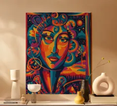 Con le sue caratteristiche linee nere decise e i campi di colore vibranti di ciano, magenta e giallo, Signorino cattura un momento di metamorfosi interiore.