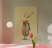 Un'affascinante illustrazione di un piccolo coniglio vestito per un'avventura autunnale. Avvolto in un'accogliente sciarpa e con uno zaino in spalla, questo dolce personaggio dei boschi cattura l'essenza della tranquilla esplorazione e del cambiamento stagionale. Con i suoi colori tenui e il suo tono nostalgico, quest'opera d'arte dona calore e fantasia a qualsiasi spazio, ideale per gli amanti della natura, i sognatori e gli appassionati di libri di fiabe.