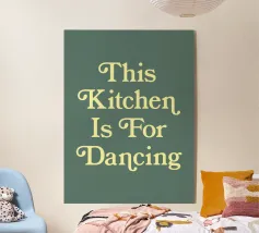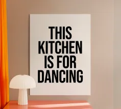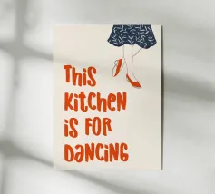 Un'allegra insegna dichiara "Questa cucina è per ballare" in grassetto a lettere rosse su sfondo beige. Il design giocoso suggerisce un'atmosfera vivace e accogliente, perfetta per attività gioiose.