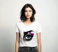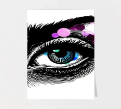 Un sorprendente occhio femminile, illustrato in un espressivo stile linoleografico con linee decise e texture scolpite, è al centro della scena. Lo sguardo è acuto, misterioso e aperto all'interpretazione: guardare o sognare, osservare o ricordare. Intorno all'occhio, cerchi vivaci di rosa elettrico, rosso intenso, giallo solare e blu cielo si irradiano verso l'esterno come esplosioni di emozioni o frammenti di pensiero. La tavolozza minimalista e il contrasto tra la sensazione di taglio a mano dell'occhio e la precisione digitale dei cerchi rendono quest'opera allo stesso tempo vintage e fresca, poetica e pop.