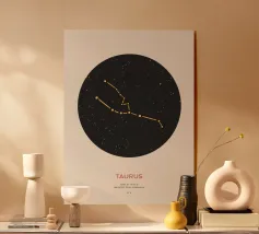 Illustrazione del segno zodiacale del Toro in uno stile simpatico e vivace. Questo gentile toro dorato, che sfreccia lungo una scia di arcobaleno con dettagli di stelle, rappresenta la natura calma ma determinata del Toro. Perfetto per chi ama l'astrologia e cerca un tocco colorato e unico per personalizzare il proprio spazio.