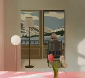 A serene and realistic painting captures the view from a cozy room, with an armchair and lamp in the foreground, looking out a large window onto a tranquil lake and snow capped mountains.