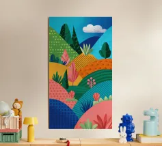 Un paesaggio stilizzato presentato come una trapunta di diversi elementi naturali, tra cui una foresta, un sole, nuvole e motivi astratti, in un affascinante stile di arte popolare.