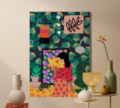 In Mascaro's art, nature serves as |a storytelling partner, enhancing themes of femininity, resilience, and harmony. The intertwining vines, leaves, and flowers suggest a mythic unity between women and nature. Through her refine