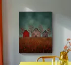 Three silent shapes against the breeze, Standing still on the edge of time, With windows like heavy, shuttered eyes O’er a field of poppies and sighs. The earth burns with an ancient red, While the sky, in its weary green, Rests on the roofs like a secret unsaid. No footstep falls, no voice is heard, Only the wait for those long gone, Midst barren trees with blossoms of blood.