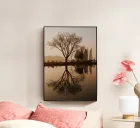 The water below mirrors the tree perfectly, capturing every leaf and curve in a soft, shimmering reflection. The surface is calm, like glass, blurring the line between reality and its mirrored twin. As light shifts gently across the scene, the reflection seems to move with it — a quiet dance of nature and water, beauty and balance