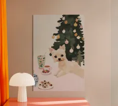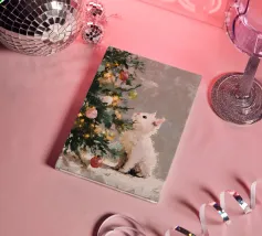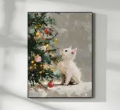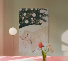 Stampa artistica da parete del gattino di Natale con albero e regali - un'accogliente decorazione festiva per gli amanti degli animali e gli appassionati del Natale.