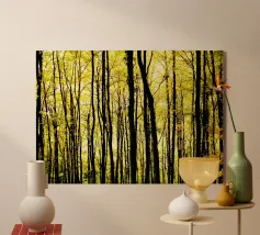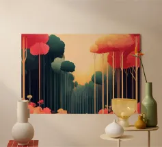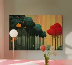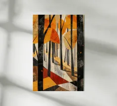 Il dipinto digitale di una foresta autunnale presenta sagome scure di alberi su uno sfondo caldo e dorato. L'opera d'arte testurizzata mostra un fogliame dettagliato nei toni dell'arancione e del marrone, creando una scena di bosco serena e suggestiva.