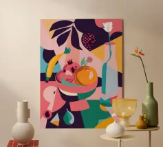 Una natura morta semplice e classica con una ciotola a righe con una mela, una pera e dell'uva, su uno sfondo rosa.