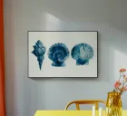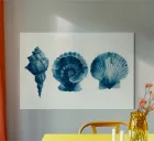 Three seashells—each iconic in form—are painted in deep, fluid washes of indigo. A conch, an ammonite, and a scallop stand side by side like silhouettes of coastal memory, unified by tone yet distinct in texture and rhythm. A bold yet serene homage to the sea’s geometry.