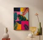 A sophisticated composition combines blocks of tropical leaf patterns with solid color fields and geometric shapes. The patchwork design in shades of blue, pink, and green creates a balanced and stylish piece that is both modern and natural.