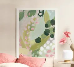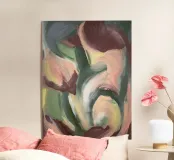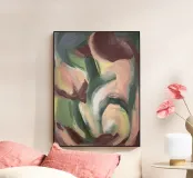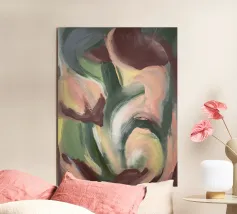 "Tulipano" è una composizione astratta lirica che affascina con pennellate morbide e organiche e una tavolozza di colori tenui. La forma centrale è rappresentata da una danza vorticosa di delicate sfumature di rosa, pesca e crema, incastonate in uno sfondo rilassante di verde oliva e rosso-marrone tenue. Lo stile pittorico è fluido e gestuale e crea un movimento delicato che ricorda gli eleganti petali di un tulipano. Questo pezzo trasmette uno stato d'animo calmo, femminile e sottile.