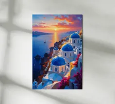 Scoprite il fascino mozzafiato dell'iconica architettura imbiancata di Santorini mentre si crogiola nella calda luce dorata del crepuscolo. Adagiati sul bordo della caldera, i tetti a cupola e gli edifici a cascata si illuminano sullo sfondo del mare Egeo. Il drammatico gioco di luci e ombre esalta la scena, mentre il cielo limpido della sera si trasforma in tonalità più profonde. Questo incantevole panorama cattura il fascino senza tempo e la tranquillità di una delle destinazioni più romantiche del mondo, evocando un senso di meraviglia e di fuga.