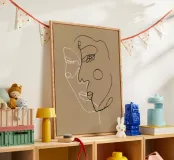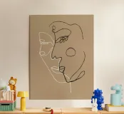 A single continuous line creates the abstract profile of a face on a beige background. The simplicity of the line drawing contrasts with the complexity of the human features it suggests, offering a minimalist interpretation of a portrait.