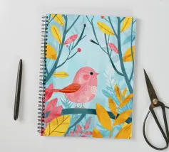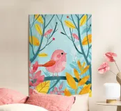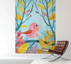 Uccello rosa appollaiato su un ramo circondato da piante frondose plexiglass