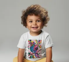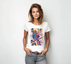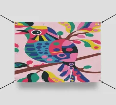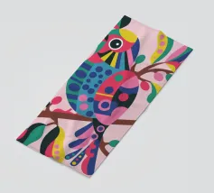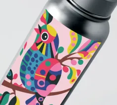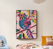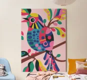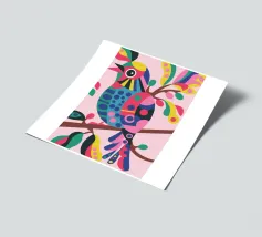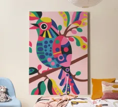 Un uccello altamente decorativo e colorato seduto su un ramo, ricco di motivi intricati e dettagli artistici.