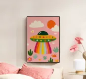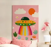 UFO colorato in un paesaggio rosa plexiglass